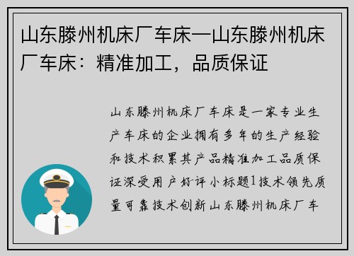 山东滕州机床厂车床是一家专业生产车床的企业,拥有多年的生产经验和技术积累。其产品精准加工,品质保证,深受用户好评。 **小标题1:技术领先,质量可靠** 技术创新 山东滕州机床厂车床引进了先进的生产设...